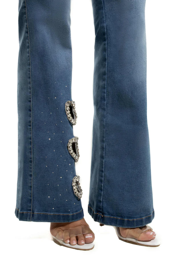 Este modelo incorpora un hermoso detalle en forma de corazón con pedrería en la bota derecha, una pieza única que aporta brillo y personalidad sin perder la elegancia. Además, posee bolsillos traseros con pedrería sutil, creando un toque femenino y sofisticado.