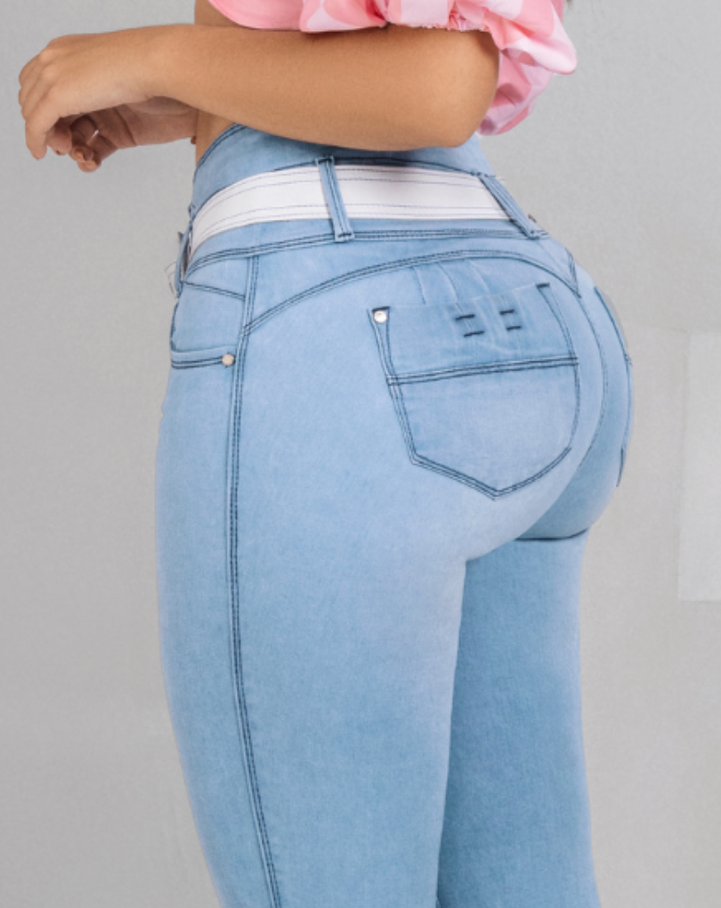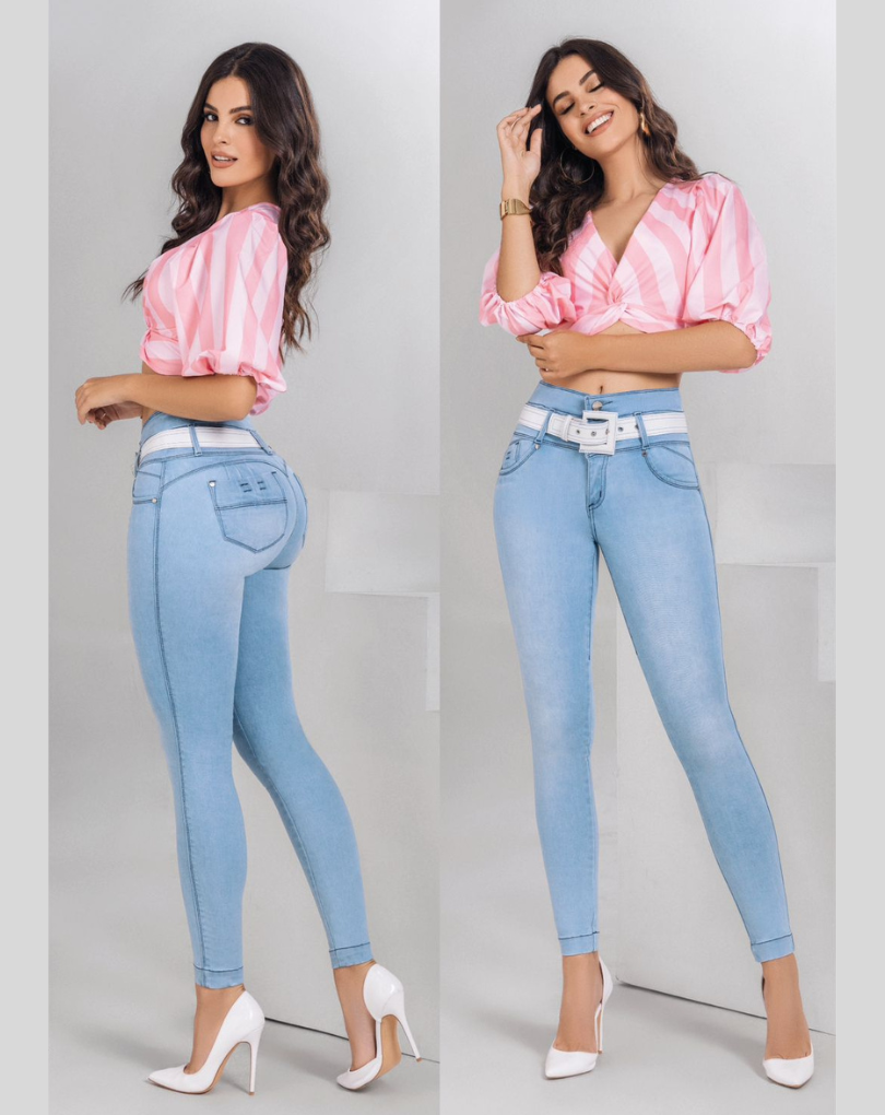 1. Estilo Versátil: El jean azul claro con bolsillos push-up ofrece una versatilidad incomparable. Su tono claro sirve como lienzo perfecto para experimentar con diversos estilos. Ya sea para una salida casual con amigos o una ocasión más formal, este jean se adapta con facilidad, garantizando un look siempre a la moda.